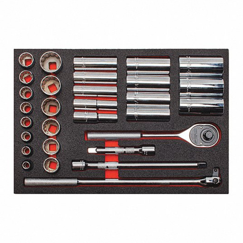 These SAE socket sets come with drive tools and an assortment of sockets for a range of fastener sizes. They come in sizes that are measured in inches and fractions of an inch to fit fasteners with an SAE (inch) size head.