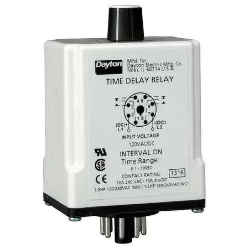 Single Function Time Delay Relay, Function - Timing Relay On Delay, Coil Volts 120V AC/DC, AC Contact Rating - Relay 10A @ 240V, DC Contact Rating - Relay 10A @ 30V, Base Type - Plug In Relay Octal, Number of Pins - Relay 8, Mounting - Relay Plug In, Contact Form - Relay DPDT, Power Consumption - Relay 2.0 W, 2.5 VA, Adjustment Method - Timer Potentiometer, Min. Time Setting - Timer 0.6 sec, Max. Time Setting - Timer 1 min, Status Indicator None, Contact Material Silver Nickel